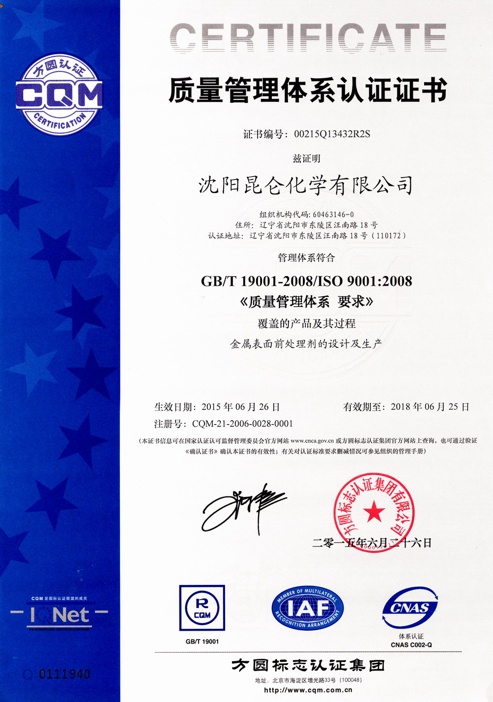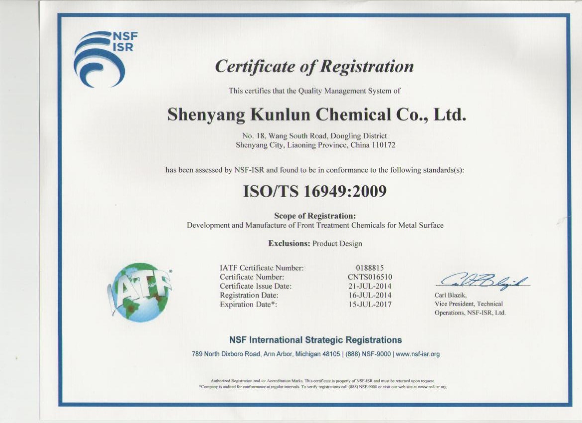 Outstanding supplier沈陽(yáng)昆侖化學(xué)有限公司是沈陽(yáng)昆侖實(shí)業(yè)有限公司與新加坡寶閣集團(tuán)共同投資的合資企業(yè)。其中,中方占51%股份,外方占49%股份公司擁有國(guó)內(nèi)獨(dú)立的知識(shí)產(chǎn)權(quán),專(zhuān)業(yè)生產(chǎn)具有國(guó)內(nèi)領(lǐng)先,國(guó)際當(dāng)代水平的各種磷化劑、硅烷覆膜劑、脫脂劑、潤(rùn)滑劑、表面調(diào)整劑、緩蝕劑、漆霧絮凝劑等七個(gè)類(lèi)別,200余個(gè)品種的相關(guān)化工產(chǎn)品。